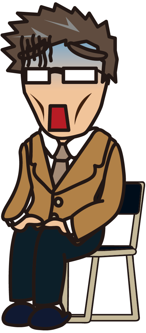 椅子に座って説明を聞きながら青ざめているおじさん「妖精さん」