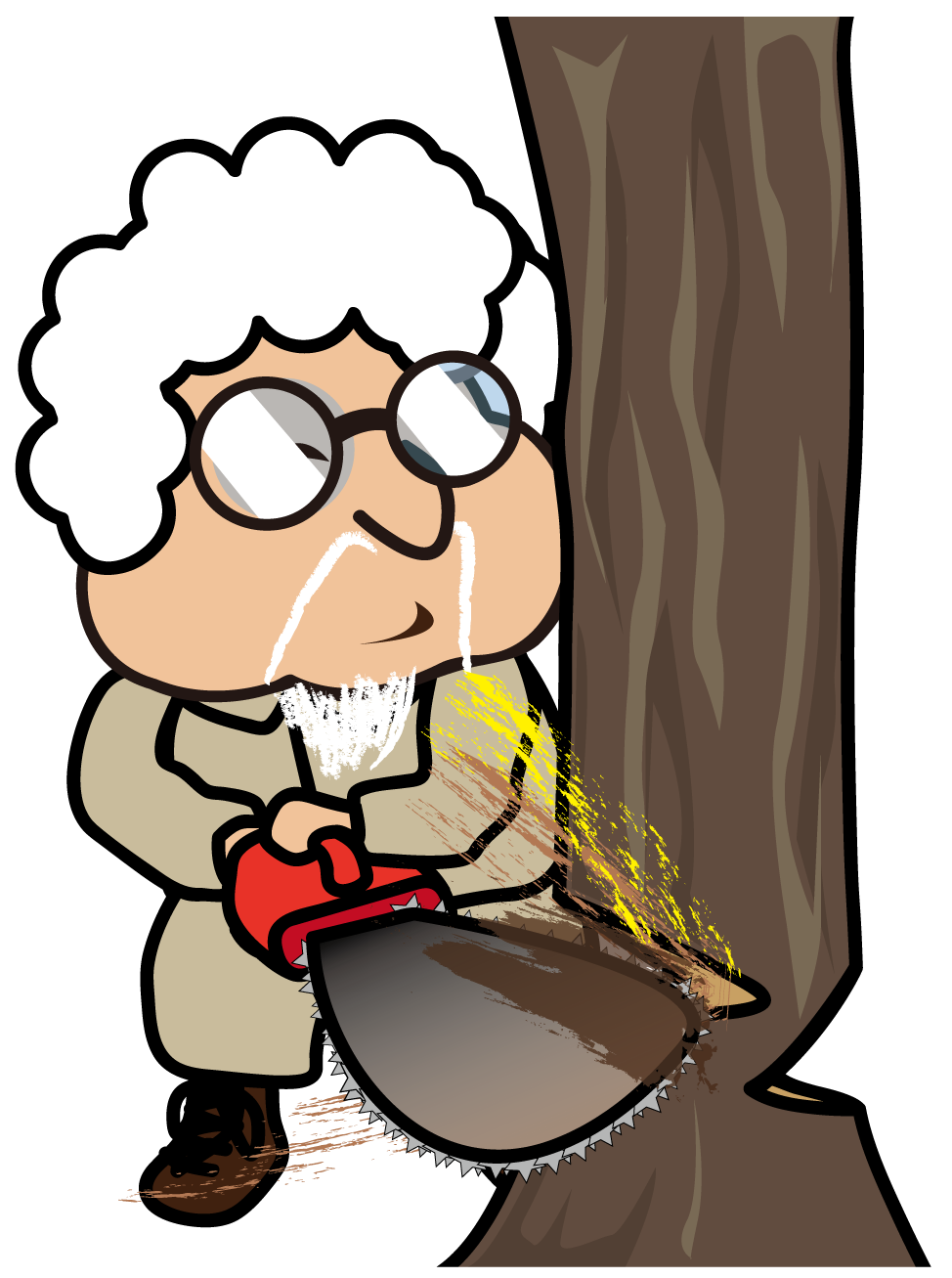 チェーンソーで木を伐採する作業服のおっさん「とっつぁん」