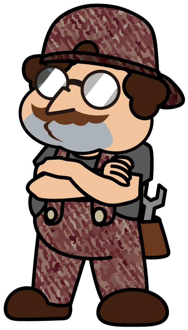 オーバーオールを着て帽子を逆に被ったオヤカタ系配管工「とっつぁん」
