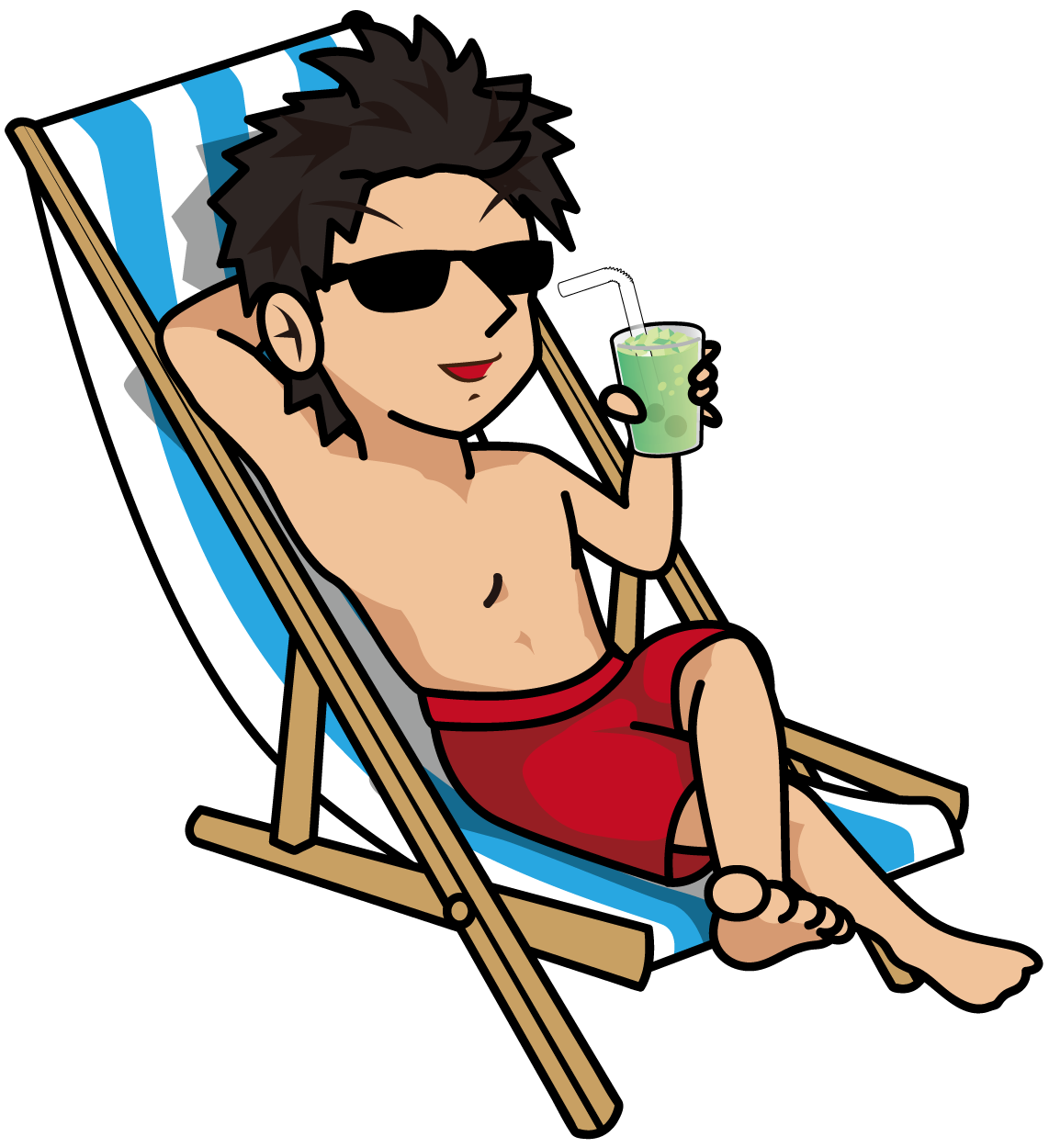 バカンスチェアでジュースを片手にくつろぐ水着の男性「とびぃ」