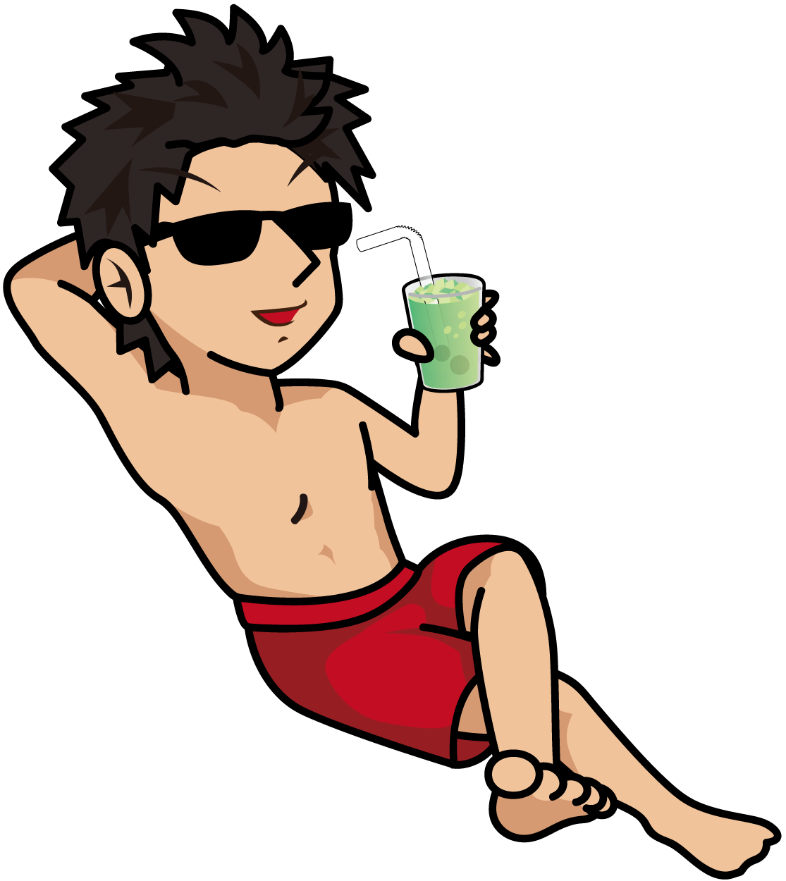 ジュースを片手にくつろぐ水着の男性「とびぃ」バカンスチェアが無いバージョン