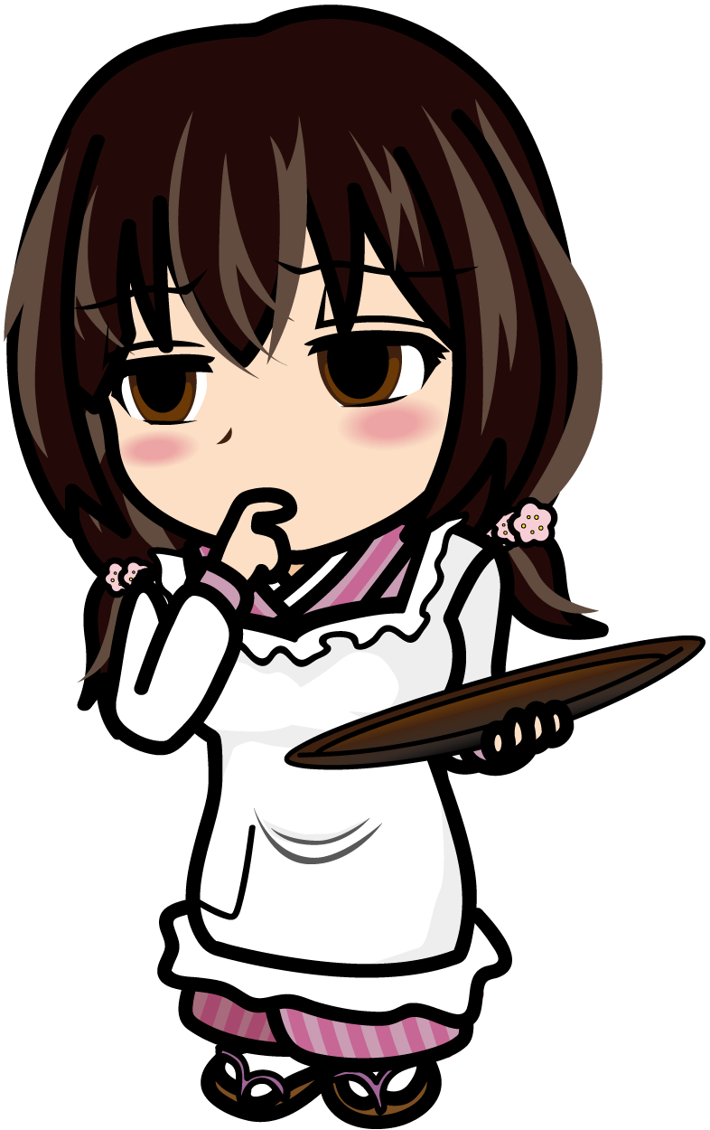 お盆を持って考え込む割烹着の女の子「あーたむ」