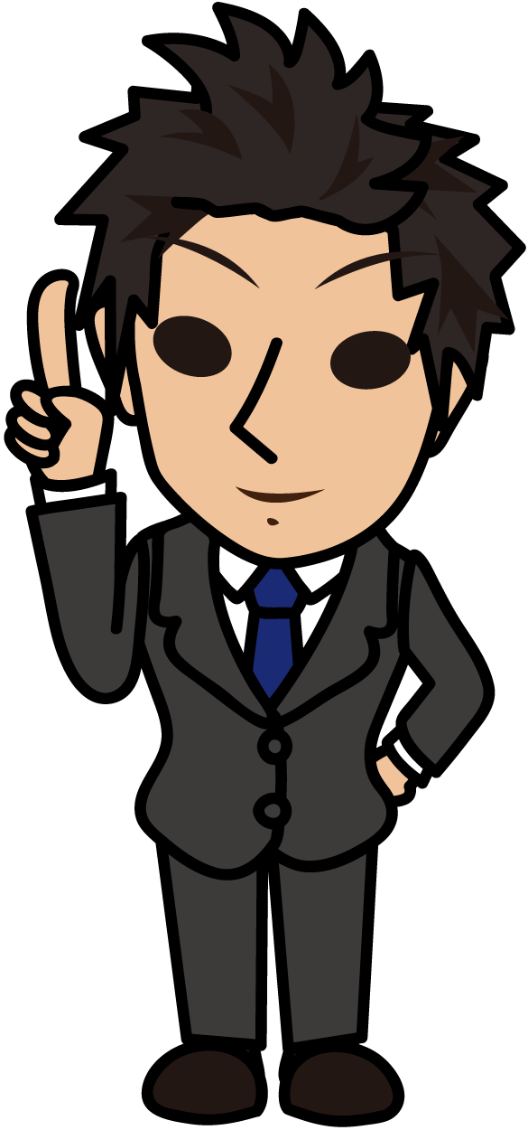 自信あり気に人差し指を立てて説明するビジネスマン「とびぃ」