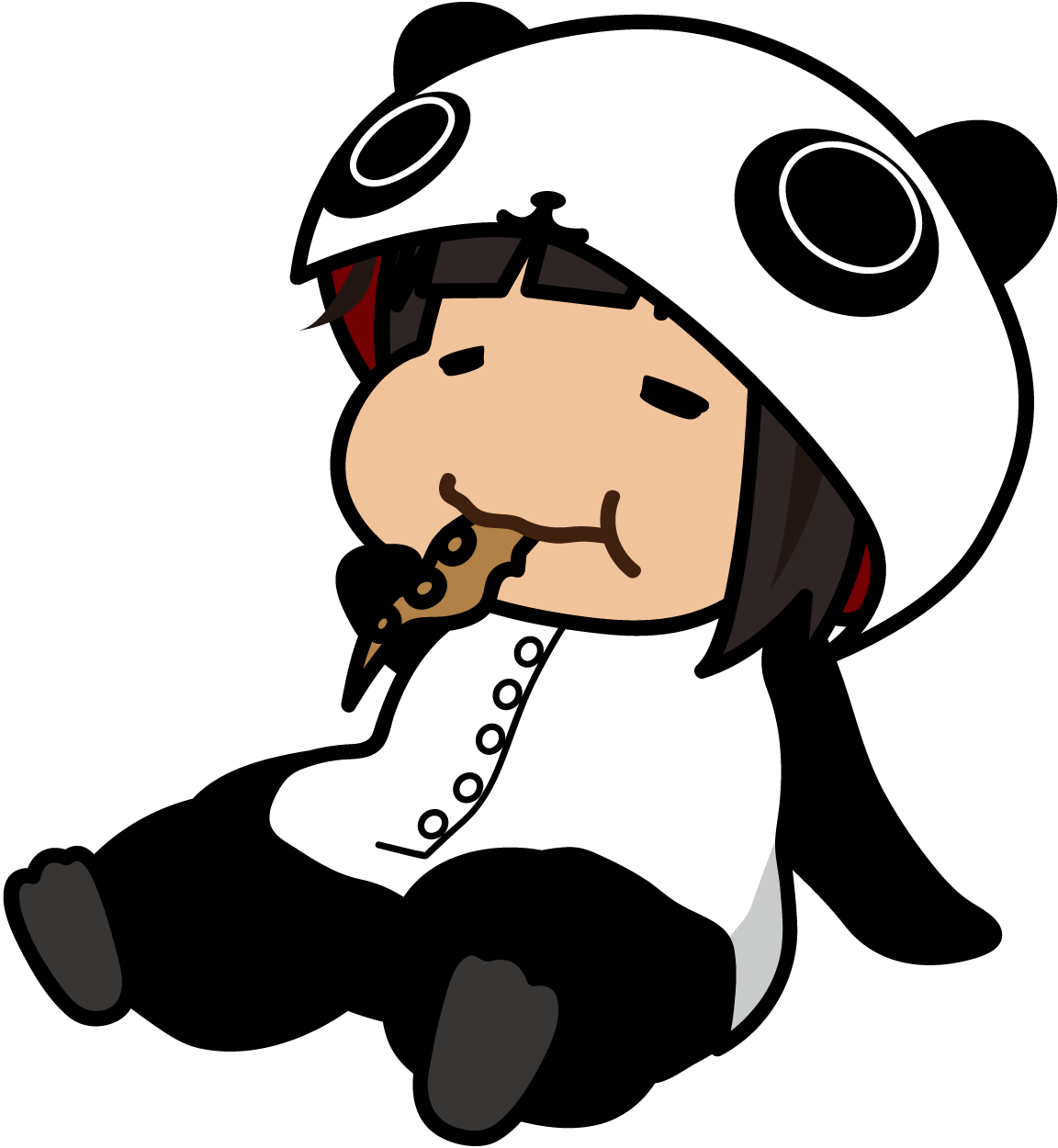 スルメイカをかじるパンダの着ぐるみの女の子「座敷あらし」