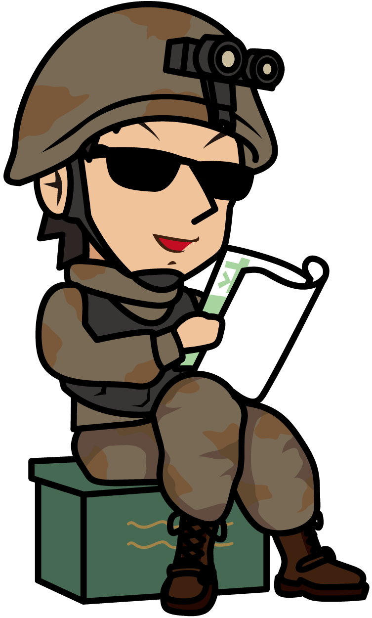 弾薬箱に座って求人情報誌を見る戦闘服の兵士「とびぃ」