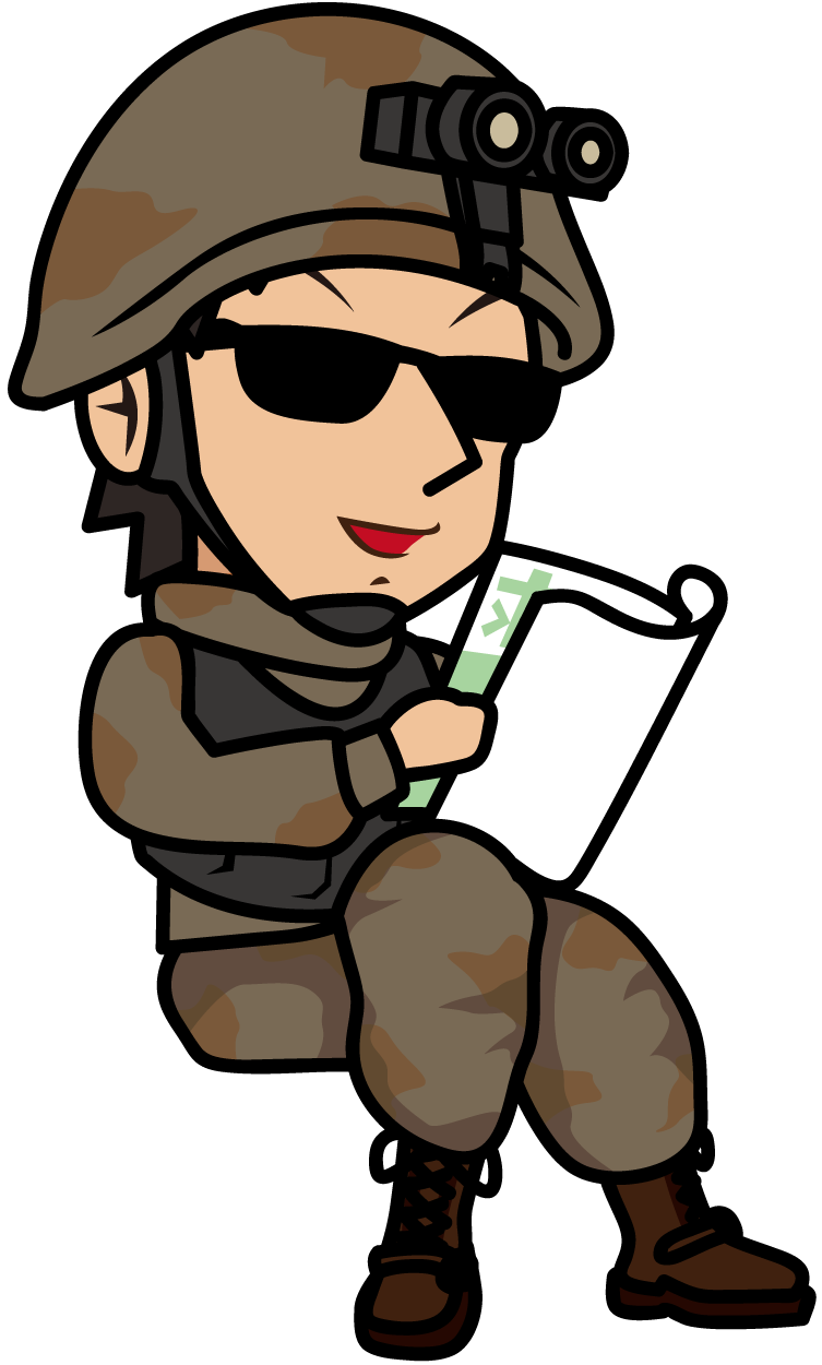 座って求人情報誌を見る戦闘服の兵士のイラスト素材「とびぃ」