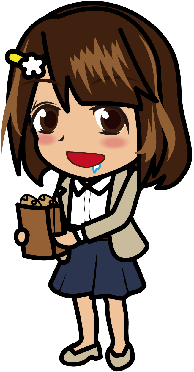 たい焼きの入った紙袋を持って涎を垂らす私服の事務員「むこりん」