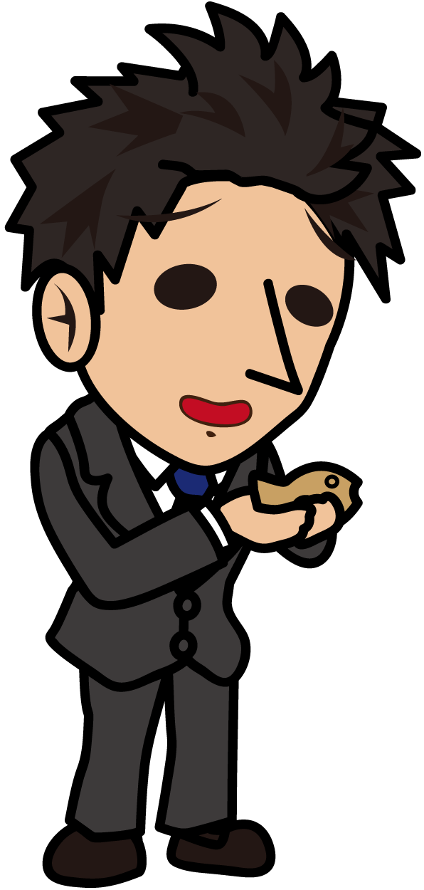 困り顔でたい焼きを見つめるビジネスマン「とびぃ」