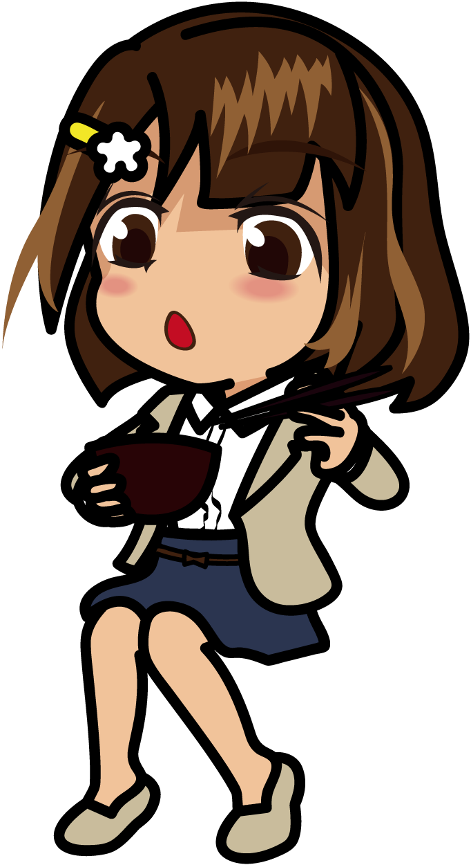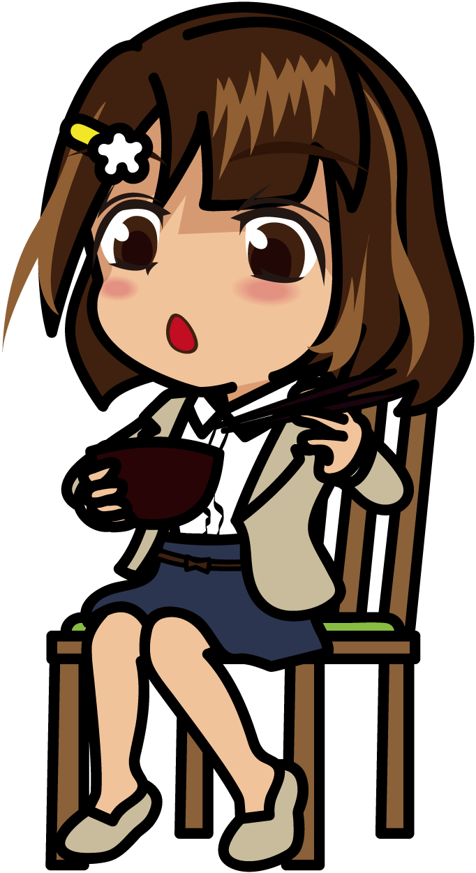 椅子に座ってごはんを食べようとする私服の事務員「むこりん」