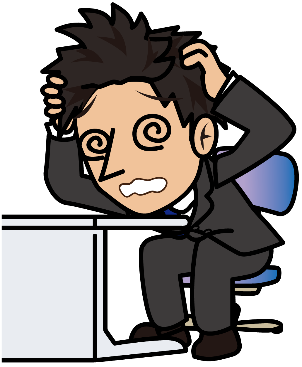 デスクで目を回しながら悩むビジネスマン「とびぃ」