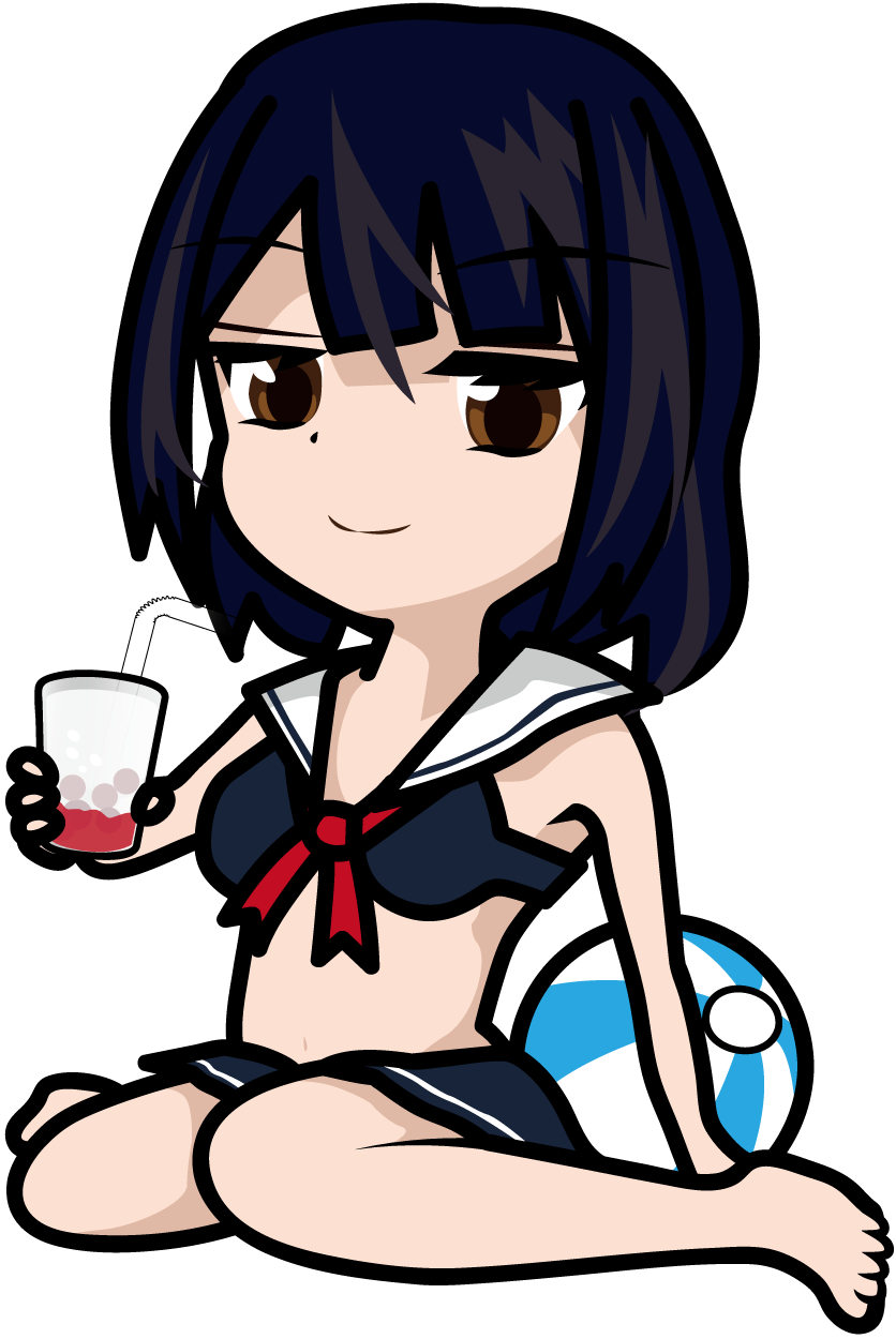 座ってタピオカドリンクを飲んでいるセーラー水着の女の子のイラスト素材「みーたむ」