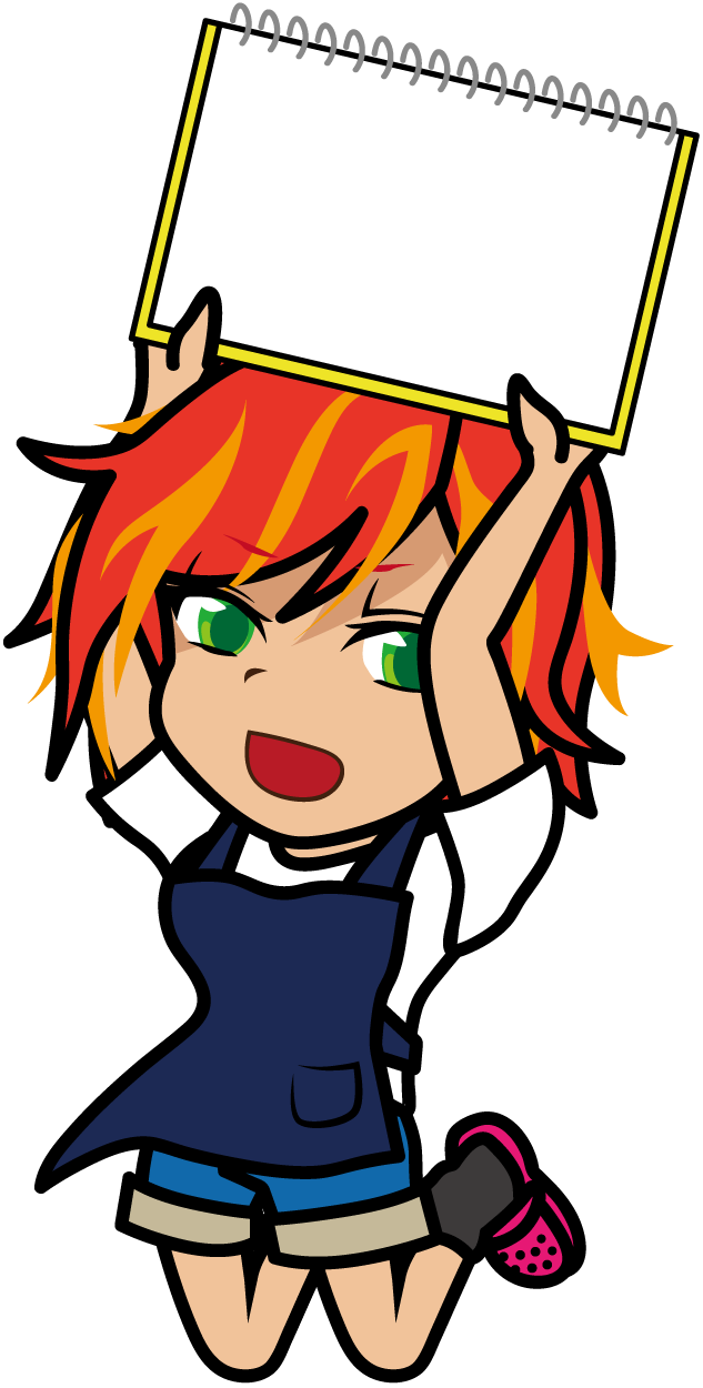 スケッチブックを見せながらジャンプするエプロン姿の店員「うりねぇ」