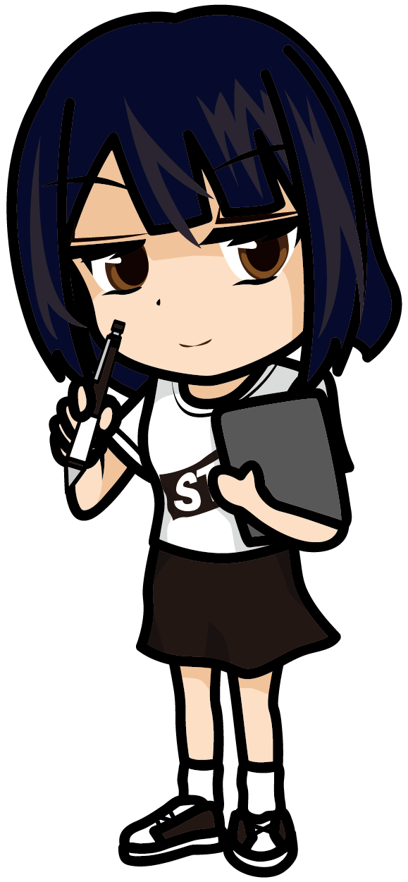 バインダーを持ってチェックする青いスタッフTシャツの女の子「みーたむ」