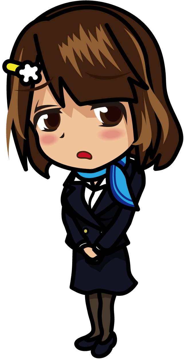 すごく嫌そうな顔で立っているCA「むこりん」