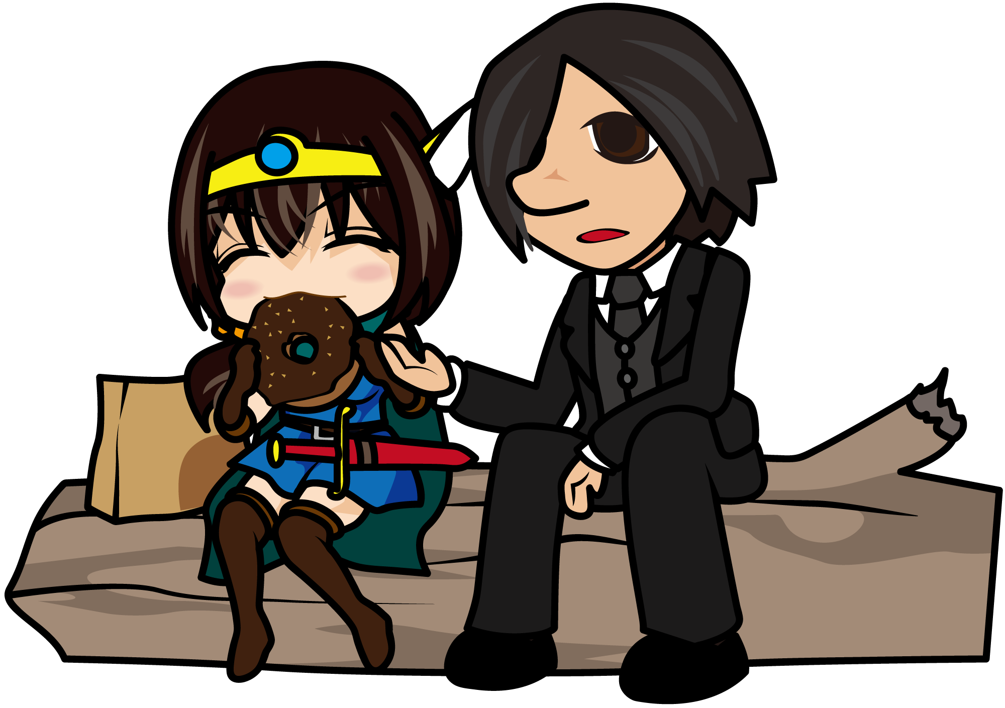倒木の上でドーナツを食べている女勇者を説得するビジネスマンのイラスト素材「あーたむ×はたさん」
