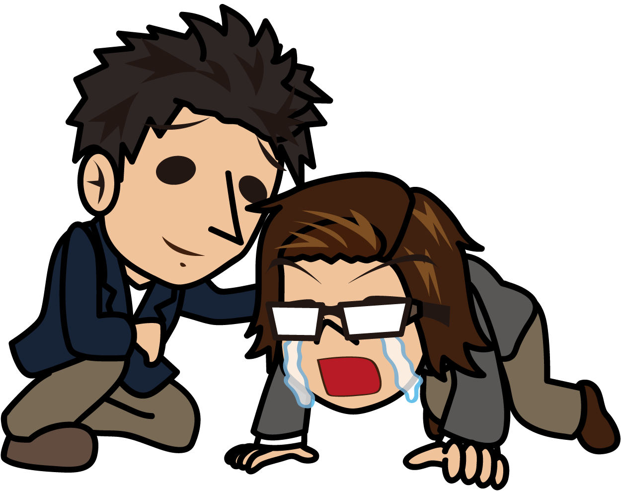 膝をついて号泣する男性とそれを慰める男性「とびぃ×うりぼぅ」