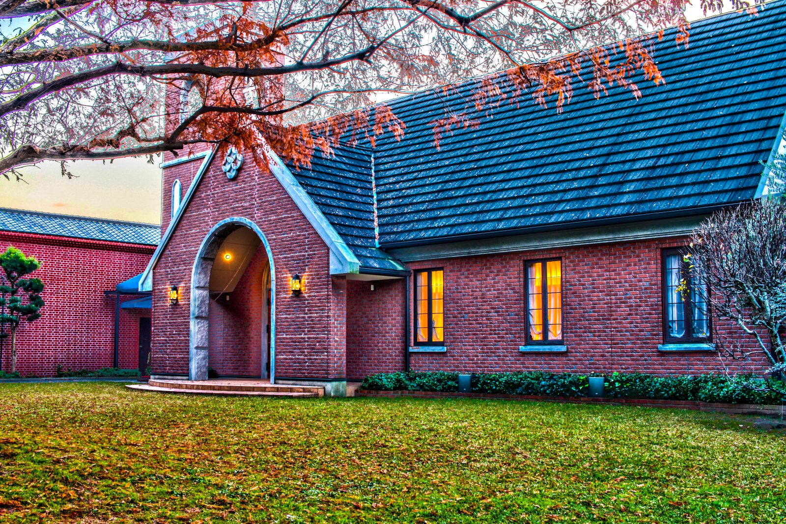 煉瓦造りの洋館と紅葉