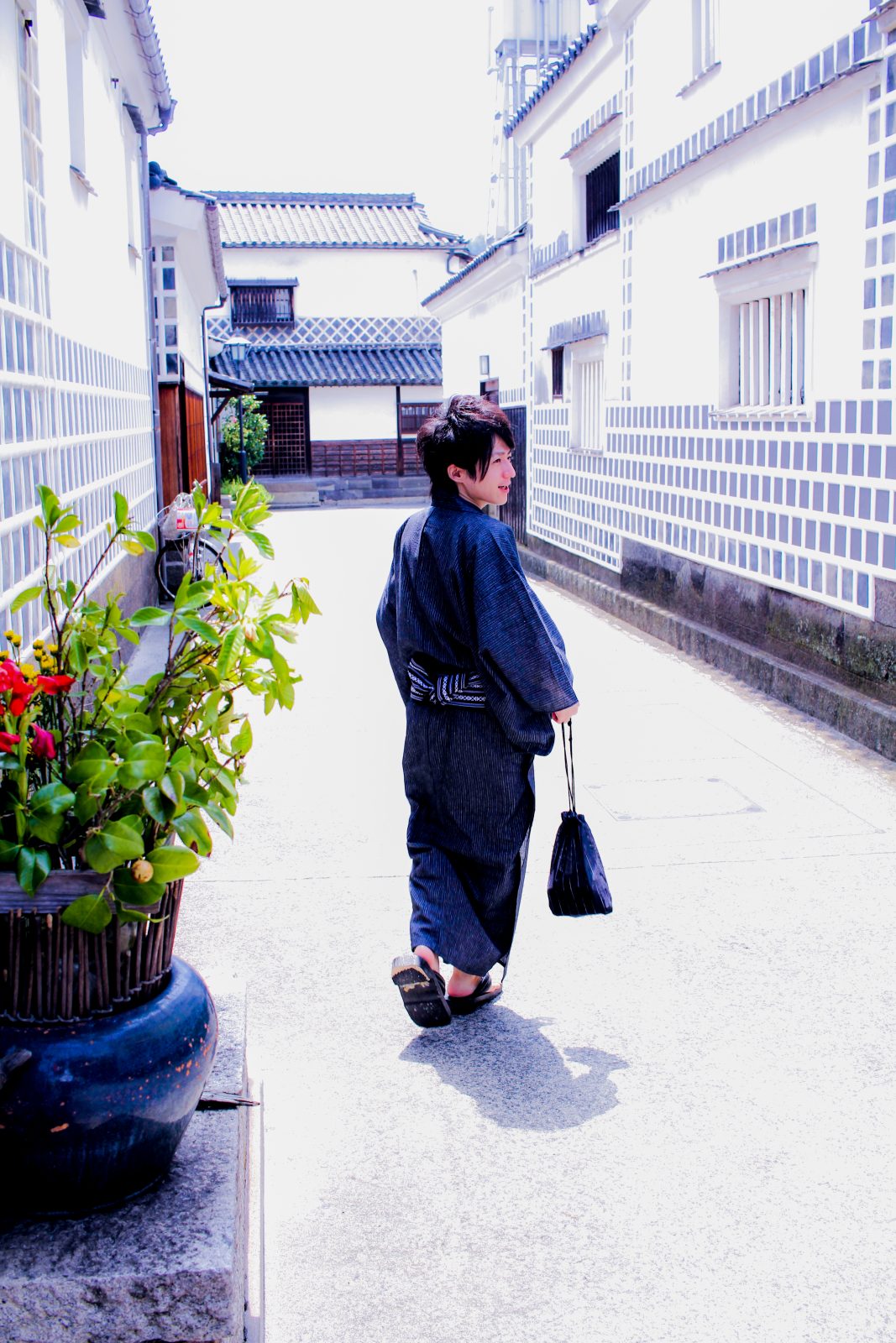 白壁の街を散歩する浴衣の男