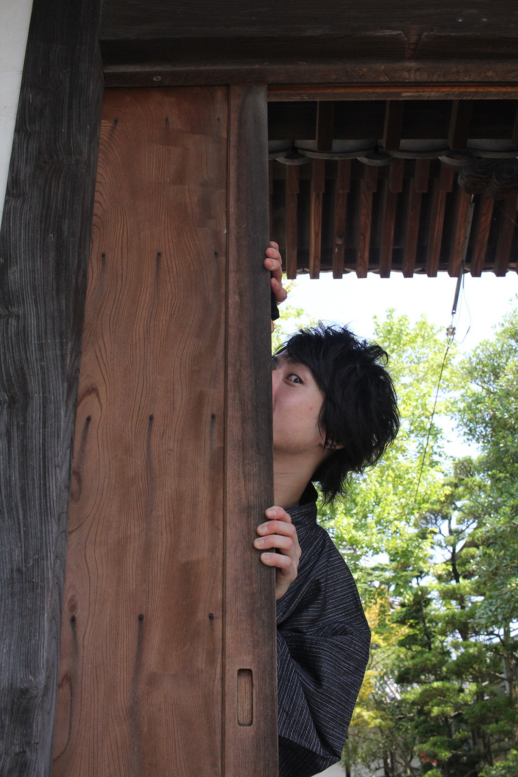 扉からのぞき込む浴衣の男