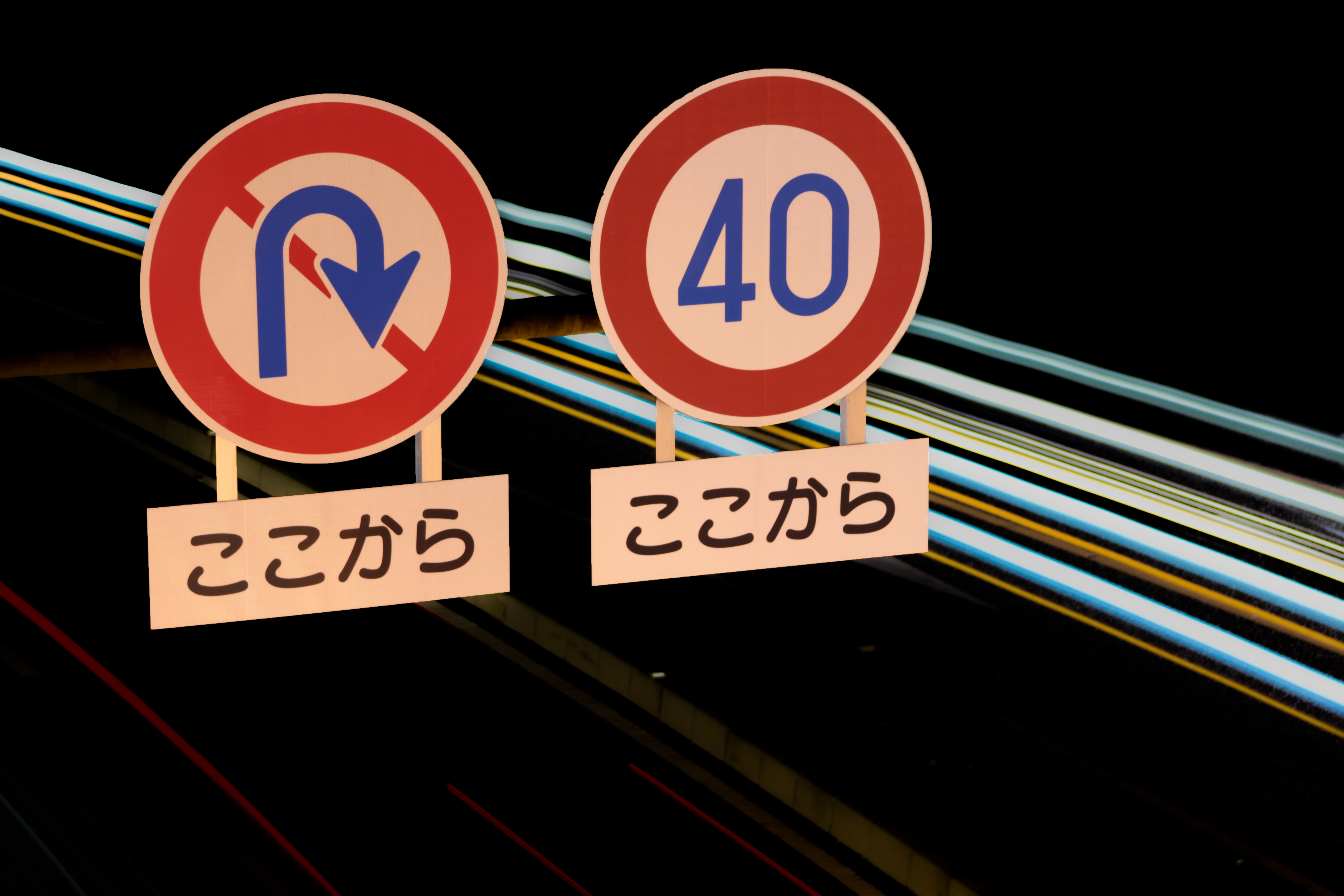 夜の道路標識と流れる光