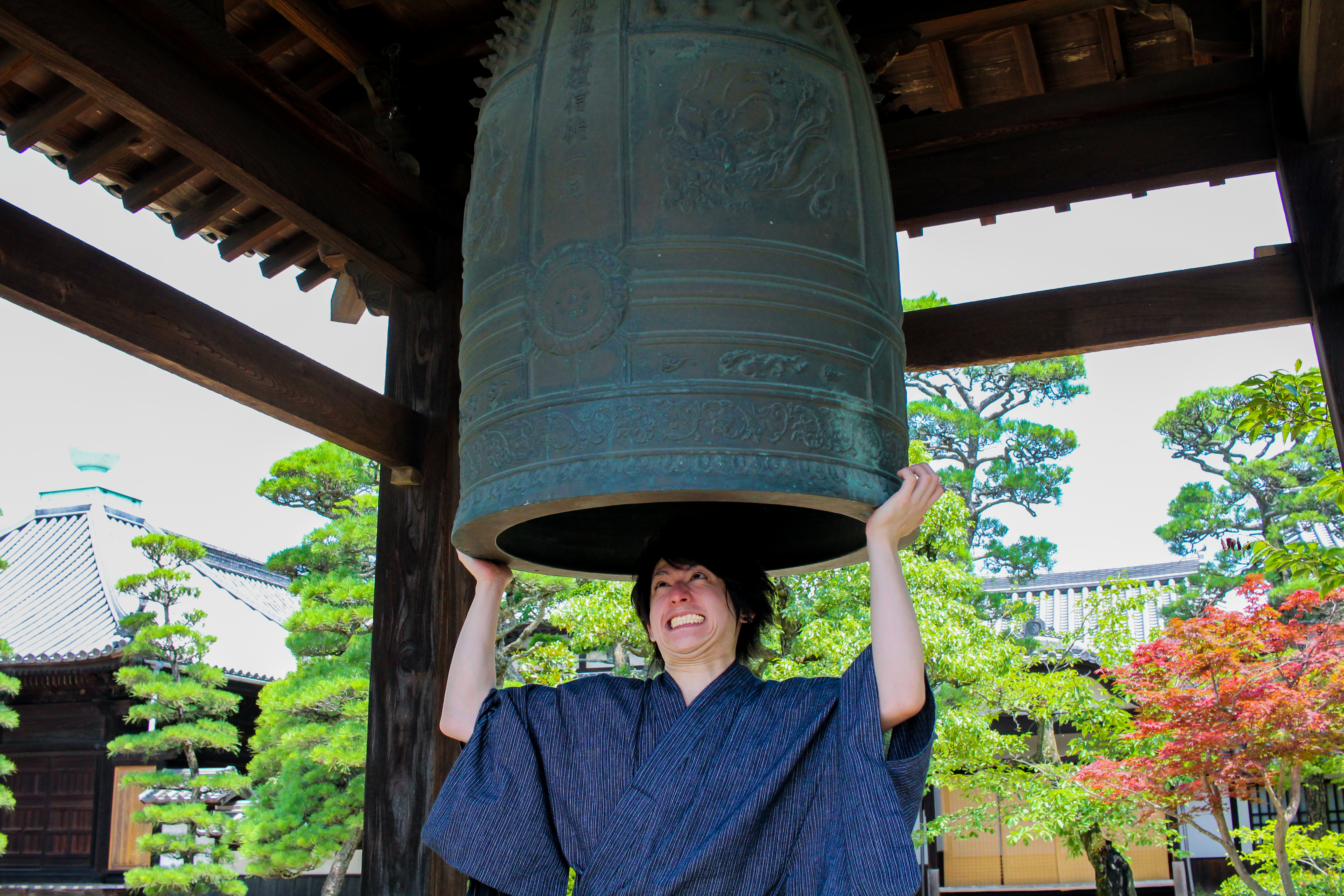 釣鐘を持ち上げる浴衣の男
